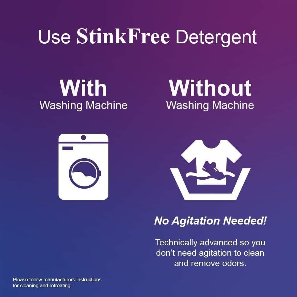 StinkFree洗衣液的專利殘留物提升技術和氣味中和劑可消除運動服裝和器材中的異味和污漬,而不僅僅是掩蓋。它可以清洗汗水和異味,並且對所有面料都安全。普通的洗衣粉無法穿透合成、技術面料中殘留的污垢和汗水,而StinkFree洗衣液專門設計攻擊和去除這些物質。