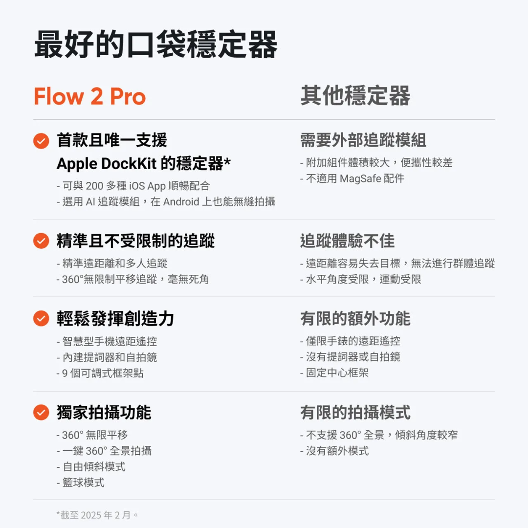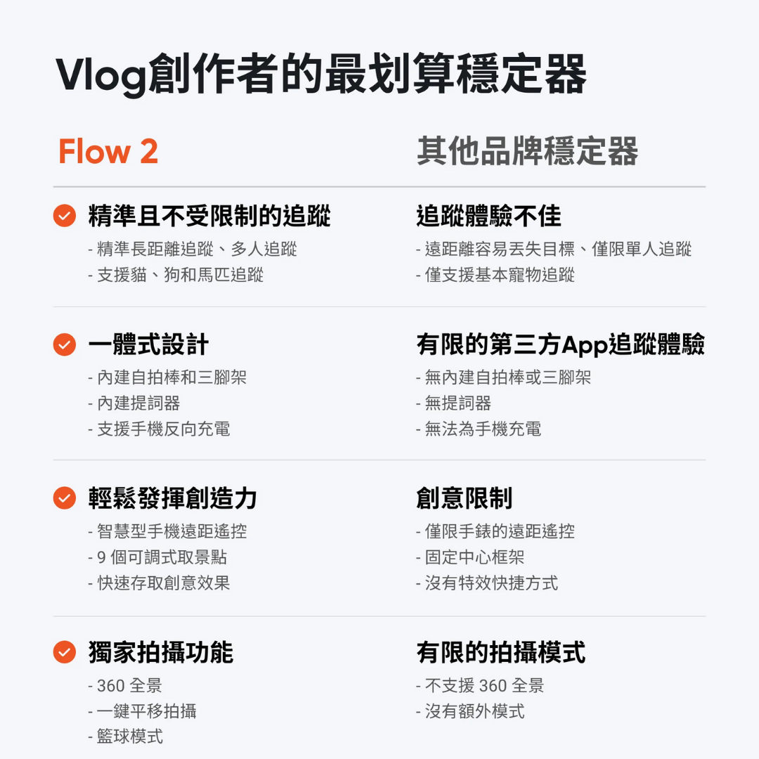 這款 Flow 2 Pro 是追求專業攝影效果的理想選擇,無論是旅遊拍攝、活動錄影還是創意影片製作,都能提供優質的拍攝體驗。