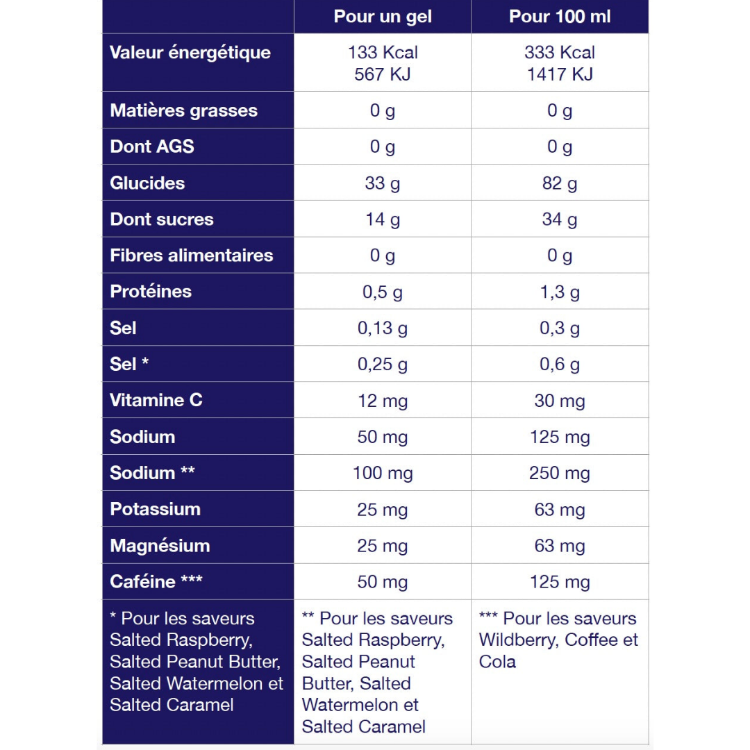 使用:在運動期間,根據您的消化耐受性,我們建議每 30 至 60 分鐘服用一包凝膠。能量膠應在每次1.5小時的訓練開始後服用。它有助於限制肌肉和肝臟中肝醣儲備的消耗。訓練期間和比賽期間均可服用。