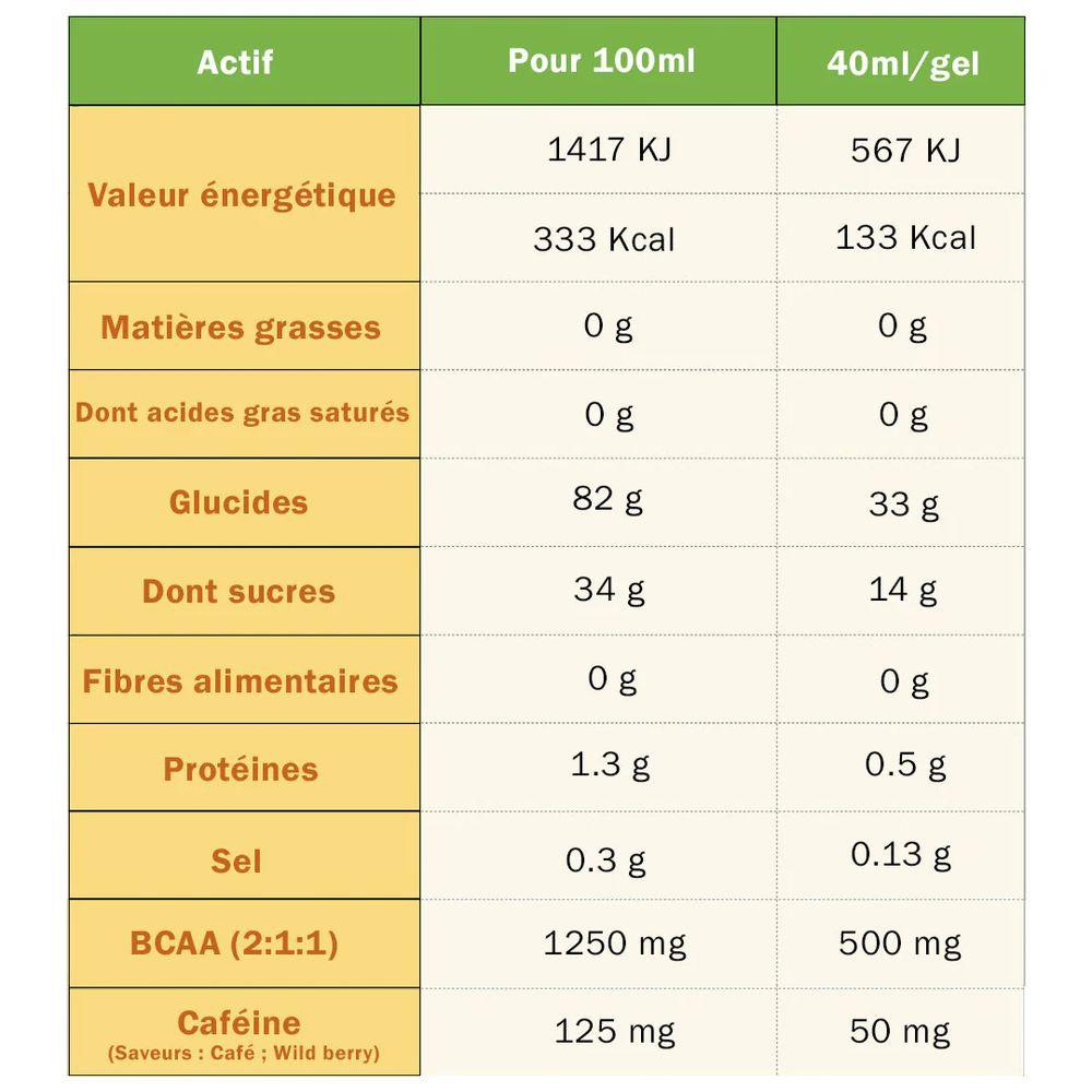 每個能量膠包含 133 千卡的能量、33 克的碳水化合物、500 毫克的支鏈氨基酸,並富含矿物質,以補充在運動中流失的電解質。部分口味(咖啡和野莓)還含有咖啡因,非常適合在需要額外提振時使用。