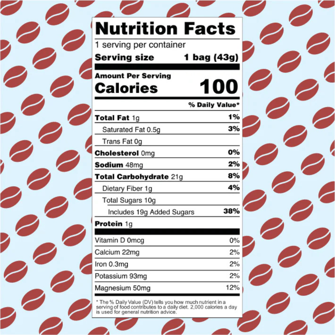 - Coffee Cacao: Filtered water, cane sugar, brown rice syrup, cocoa powder (7%), Robusta coffee (2%), pumpkin seed paste, basil seed powder, salt, vanilla extract, caffeine, magnesium oxide, potassium sorbate.