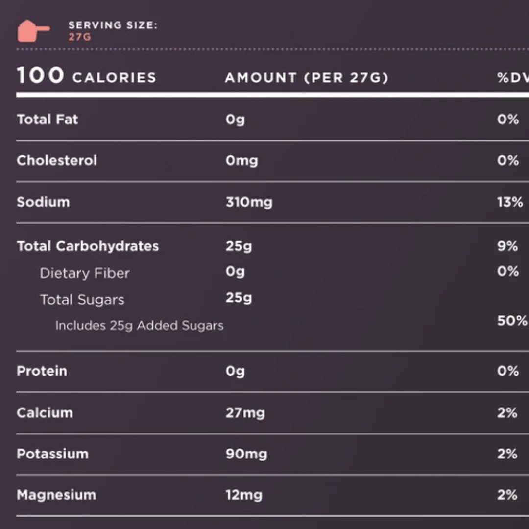Ingredients: glucose, sucrose, sodium citrate, sea salt, citric acid, natural flavorings, potassium chloride, calcium carbonate, magnesium citrate.