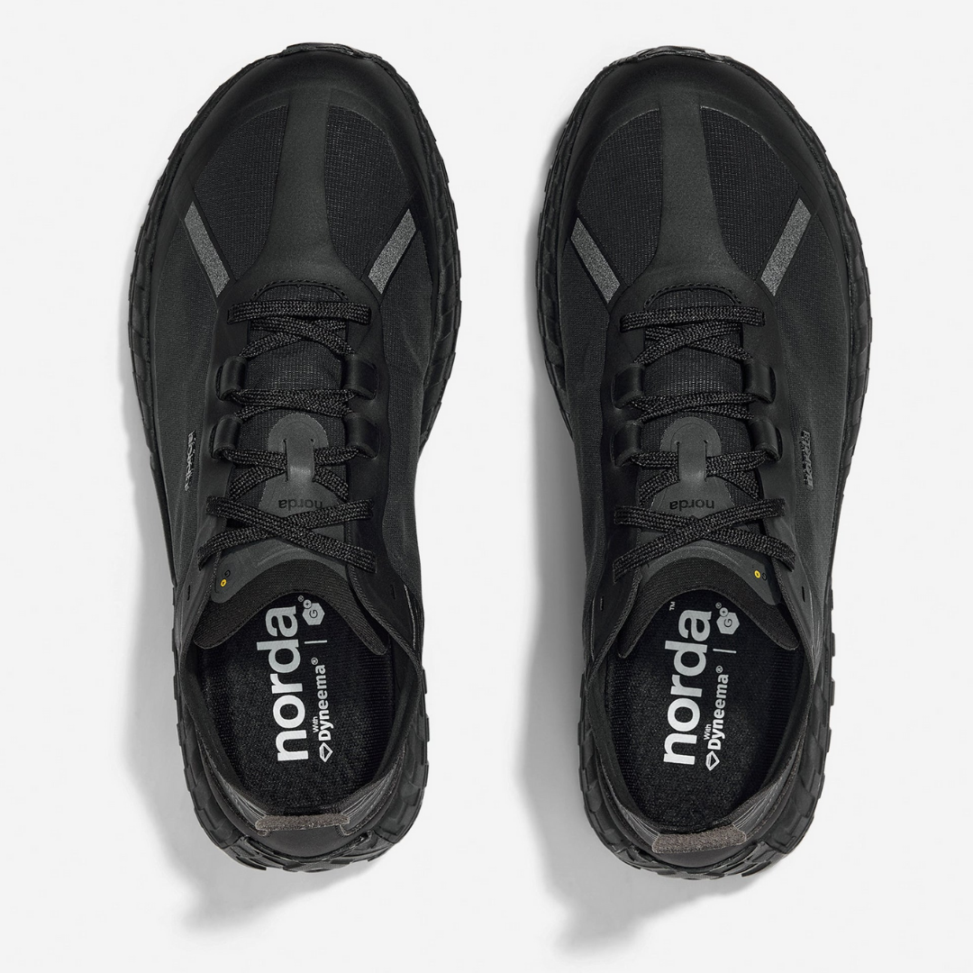 The norda™ 001A Stealth Black features a G+ Graphene waterproof membrane. The Stealth Black is made from the world's first and only bio-based black Dyneema® fiber, the world's strongest and lightest fiber™. The all-black upper is lined with a G+® Graphene membrane, which provides waterproofing to a depth of 10,000 mm, providing enhanced warmth and dryness while maintaining high breathability. The ultimate all-weather training tool.