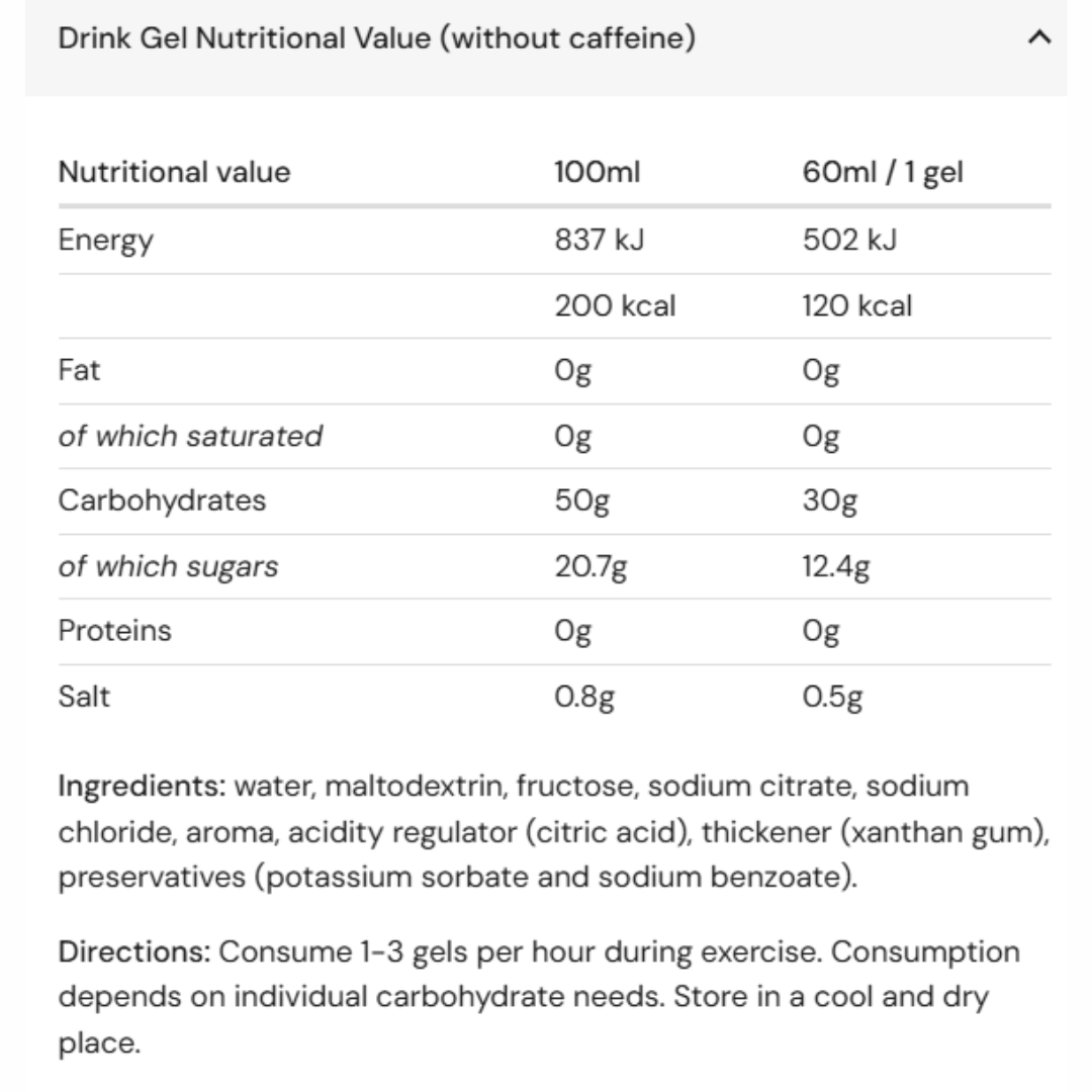 一款已加水的即饮型运动能量胶。本产品含有多种来源的碳水化合物,可缓慢释放能量(碳水化合物与水的比例为2:1)。提供多种清爽口味。