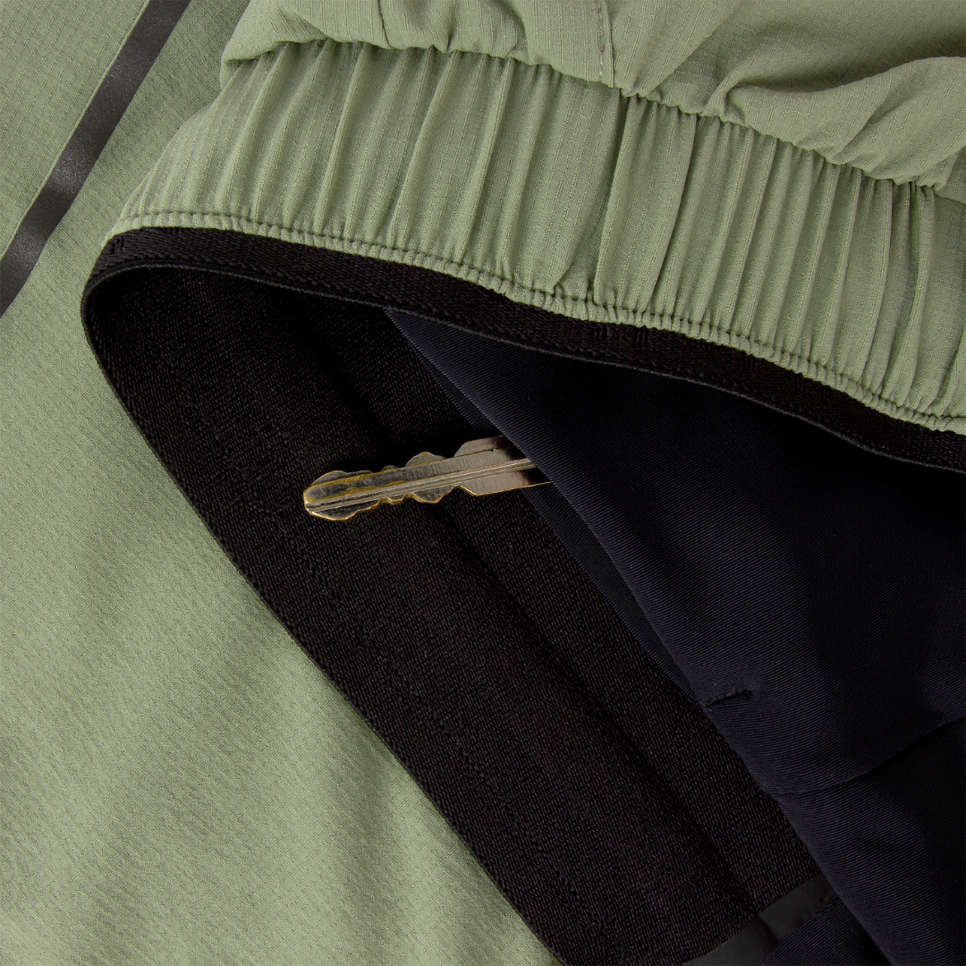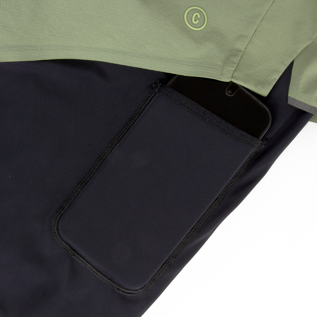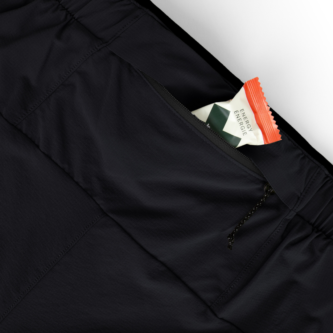 后方拉链口袋可安全收纳能量补给、卡片与钞票,另设有隐藏式内袋,让钥匙稳固不晃动。内层采用反向车缝、无摩擦设计的COOLmatic | PLUS™ 长版内衬,具备降温处理、加速排汗与异味控制机能。内衬中整合弹性货物口袋,可放置能量补给或手机,为日常长距离训练提供更充足的收纳与支援。