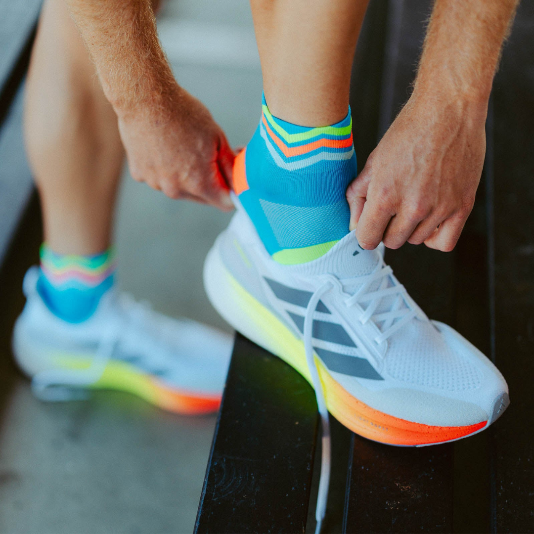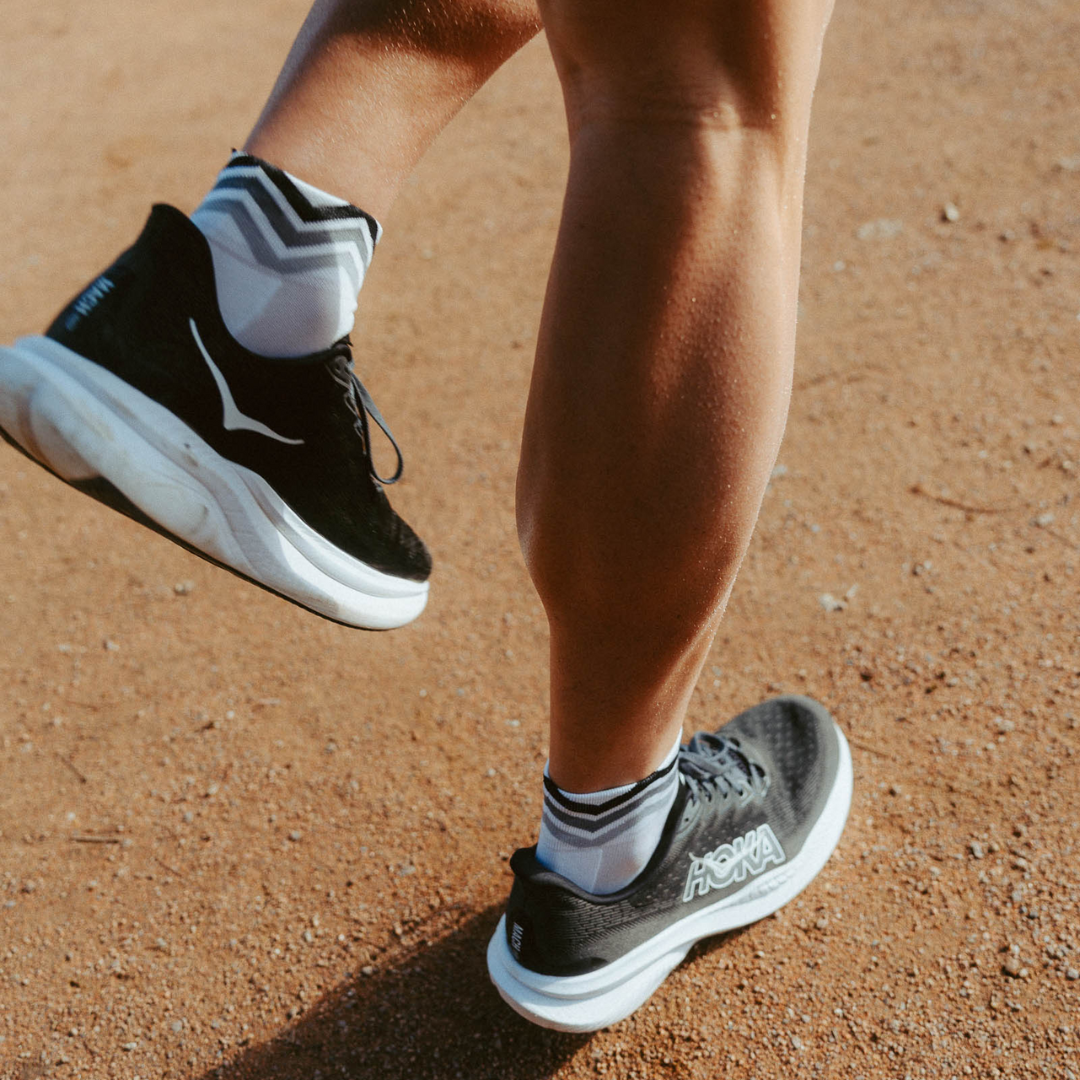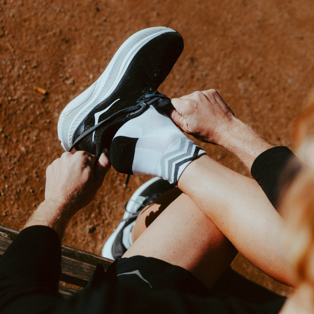 宽大的双层袖口防止滑落并有效控制汗水。脚部上方的薄网状结构确保最佳通风。中足的整合式压缩带提供稳定的合身感。足垫、脚跟和脚趾,以及跟腱和脚跟区域的加强设计,保护敏感区域。