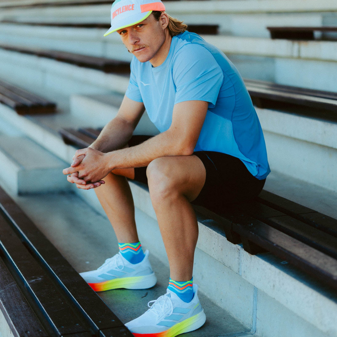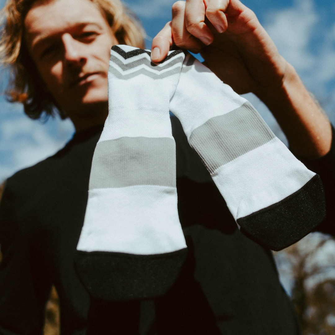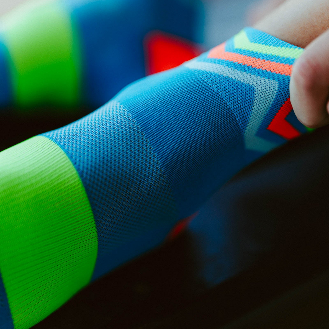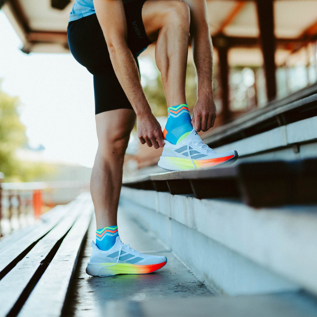 宽大的双层袖口防止滑落并有效控制汗水。脚部上方的薄网状结构确保最佳通风。中足的整合式压缩带提供稳定的合身感。足垫、脚跟和脚趾,以及跟腱和脚跟区域的加强设计,保护敏感区域。