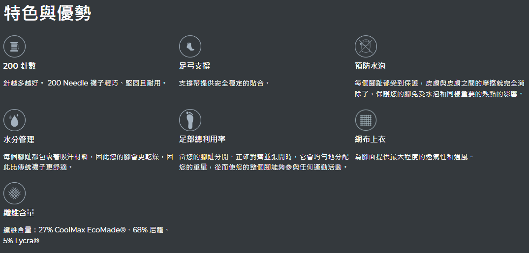 injinji Run Lightweight Mini-Crew Socks 是重量最轻的运动款踝袜,提供最大程度的舒适感而不会过于臃肿。设计上将每个脚趾都包裹住,消除了可能导致起泡的皮肤摩擦。它让您的脚趾可以自由伸展、自然对齐,并独立工作,从而提高舒适度、平衡性和抓地力。COOLMAX®纤维和透气网眼顶部能让您的双脚保持凉爽干燥,无缝人体工学设计和集成式足弓支撑则提供稳定、无滑动的贴合。短筒款设计恰好在脚踝以下,既可以防止碎屑进入,又能保持凉爽舒适。