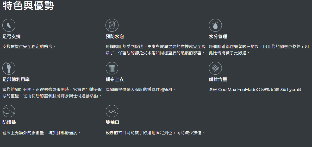 COOLMAX® EcoMade 纤维吸湿排汗,尼龙增加耐用性,而 Lycra® 保持贴合度。内建足弓支撑,顶部的网布增加了透气性,我们独特的设计将织物包裹在每个脚趾上,以最大限度地减少水泡,更有效地吸湿排汗,让您在训练跑步期间在狭窄、粗糙的小径上自由地使用整个脚超级马拉松。