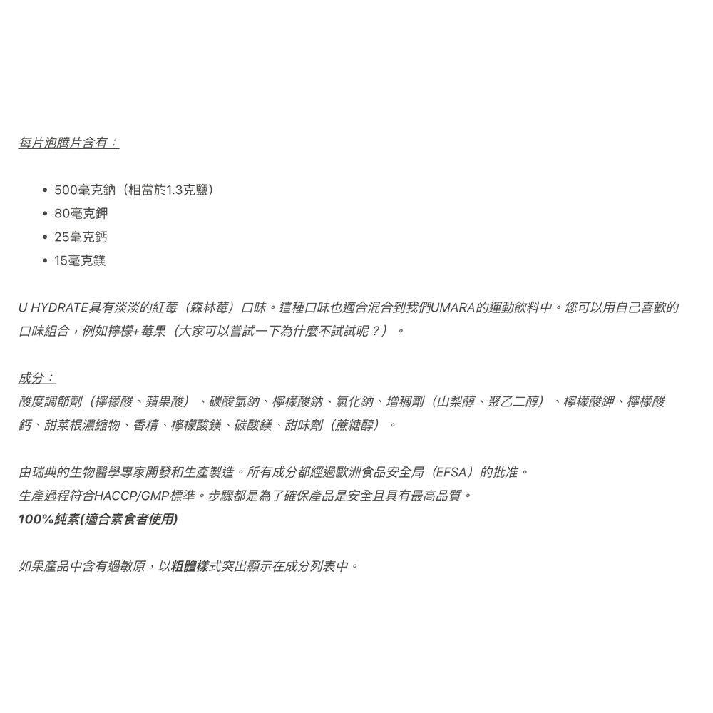 - 每片Umara U Hydrate 含有完整的电解质组成,包含您通过汗液流失的所有主要电解质。