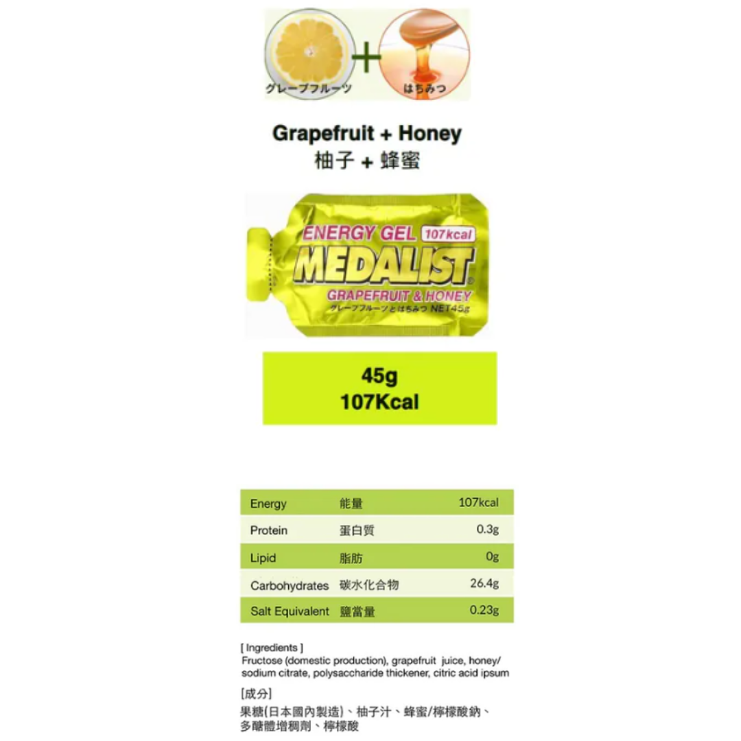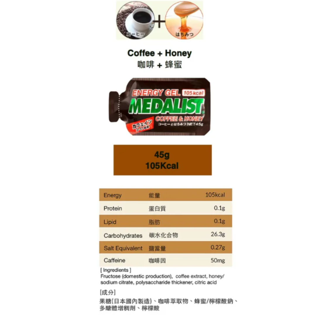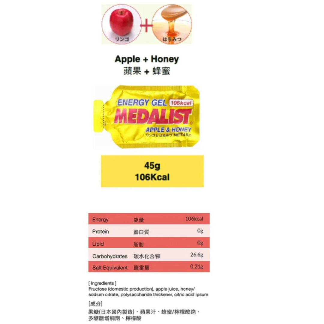 Medalist Energy Gel 采用天然成分,含有蜂蜜的温和甜味。极浓缩成分提供能量,可以补充由于长时间运动身体大量流失的糖分,不至于因低血糖而影响运动表现。