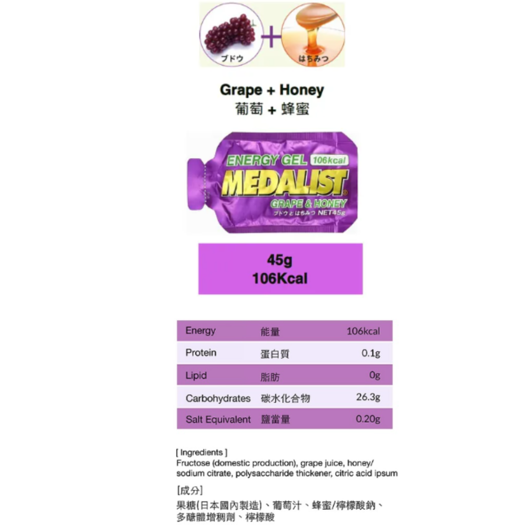 Medalist Energy Gel 有多种丰富口味提供选择,包括苹果蜂蜜味、柚子蜂蜜味、葡萄蜂蜜味及咖啡蜂蜜味。啫喱状轻松入口及有咬口,产品绝对兼顾味道满足感及有效地提供能量。