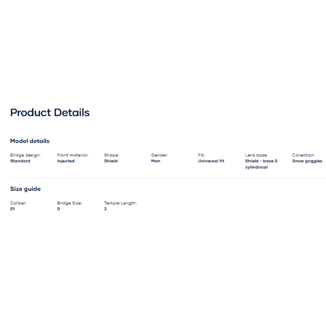 - 镜片性能:注塑成型的Plutonite® 镜片材质提供100% 防护UVA/UVB/UVC 以及波长高达400nm 的有害蓝光。