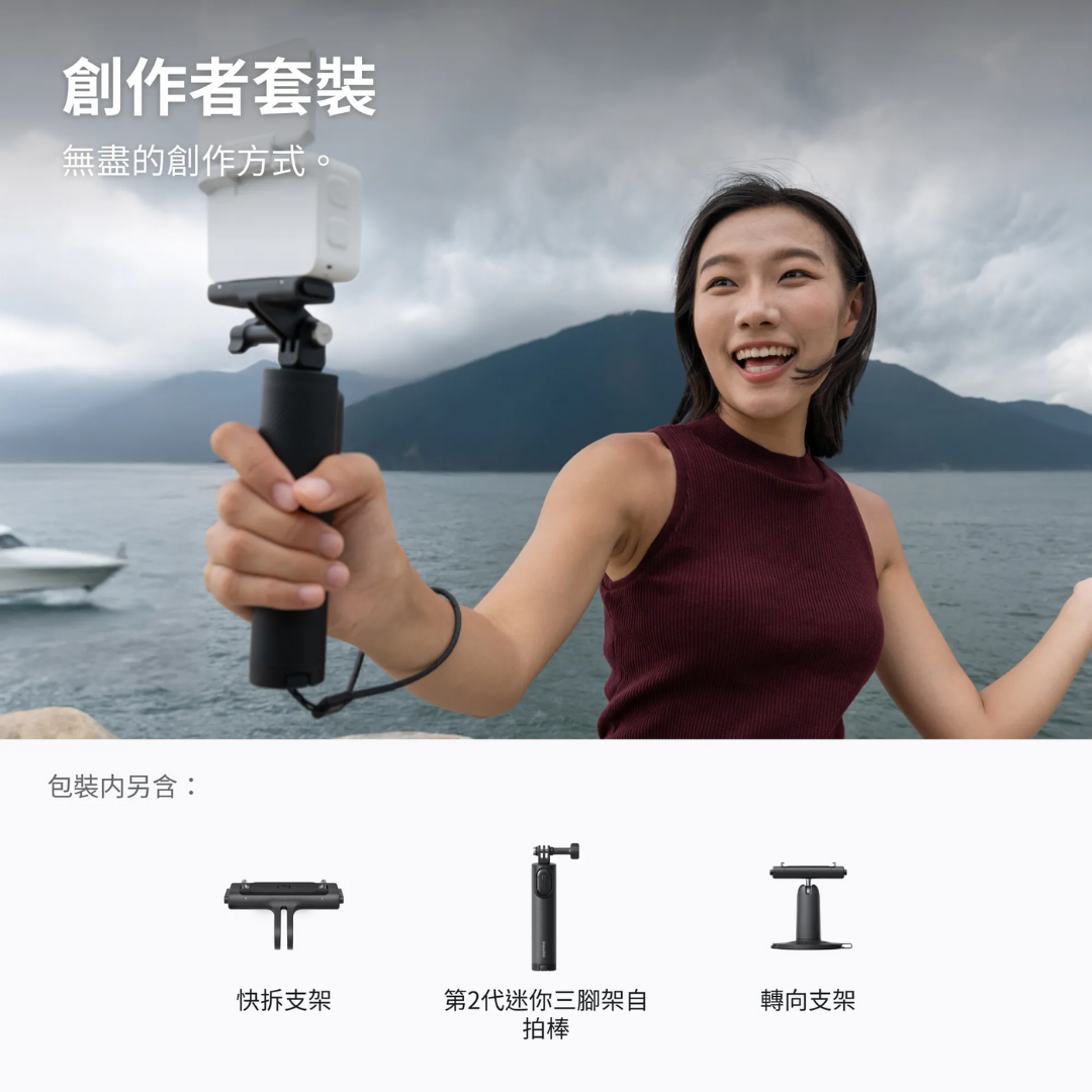Creator Bundle 包含内容:1 x GO Ultra 、1 x 快拆安全绳、1 x 磁性简易夹、1 x 磁吸挂绳、1 x 快拆支架、1 x 迷你二合一脚架2.0 、1 x 旋转支架(不包含记忆卡)